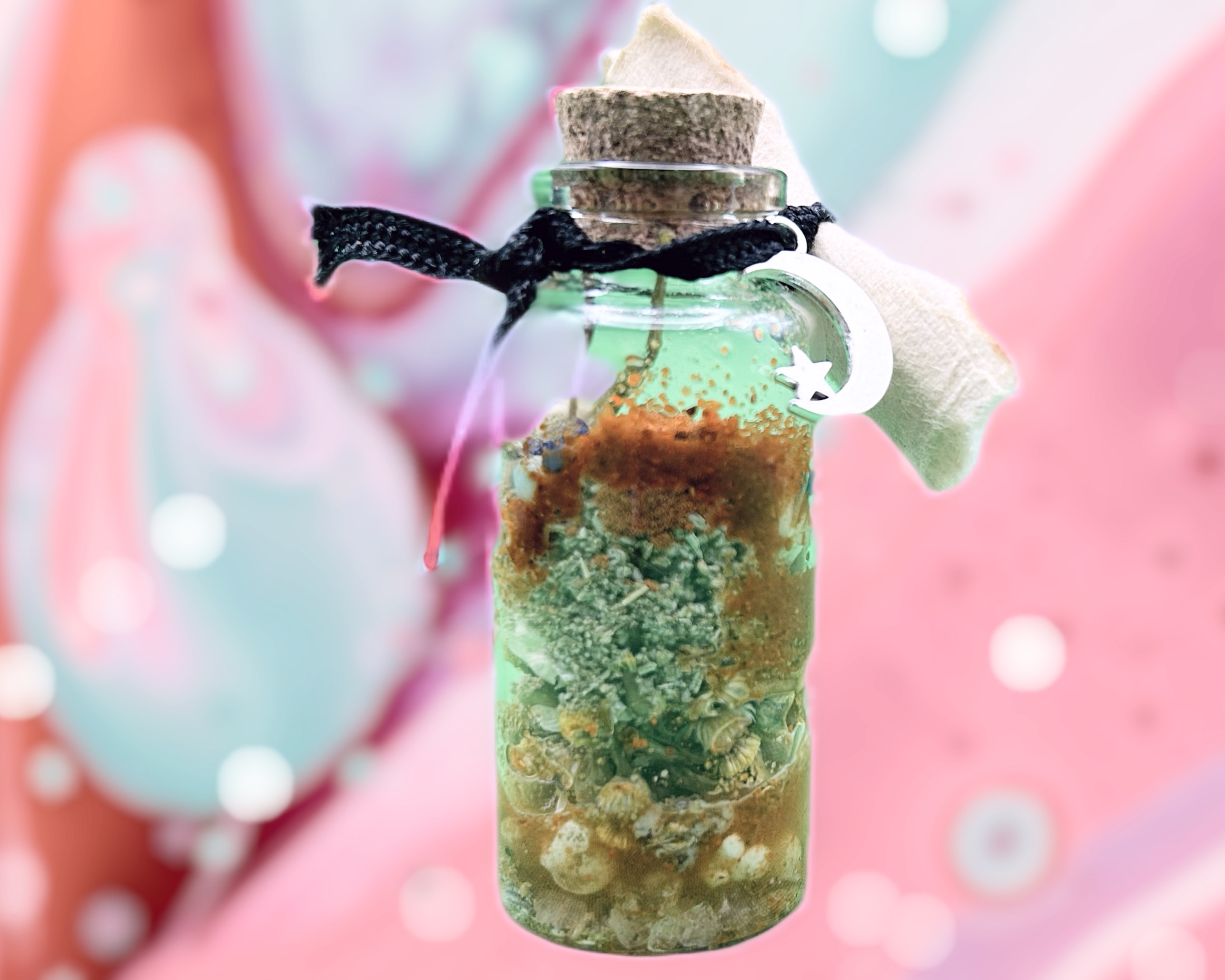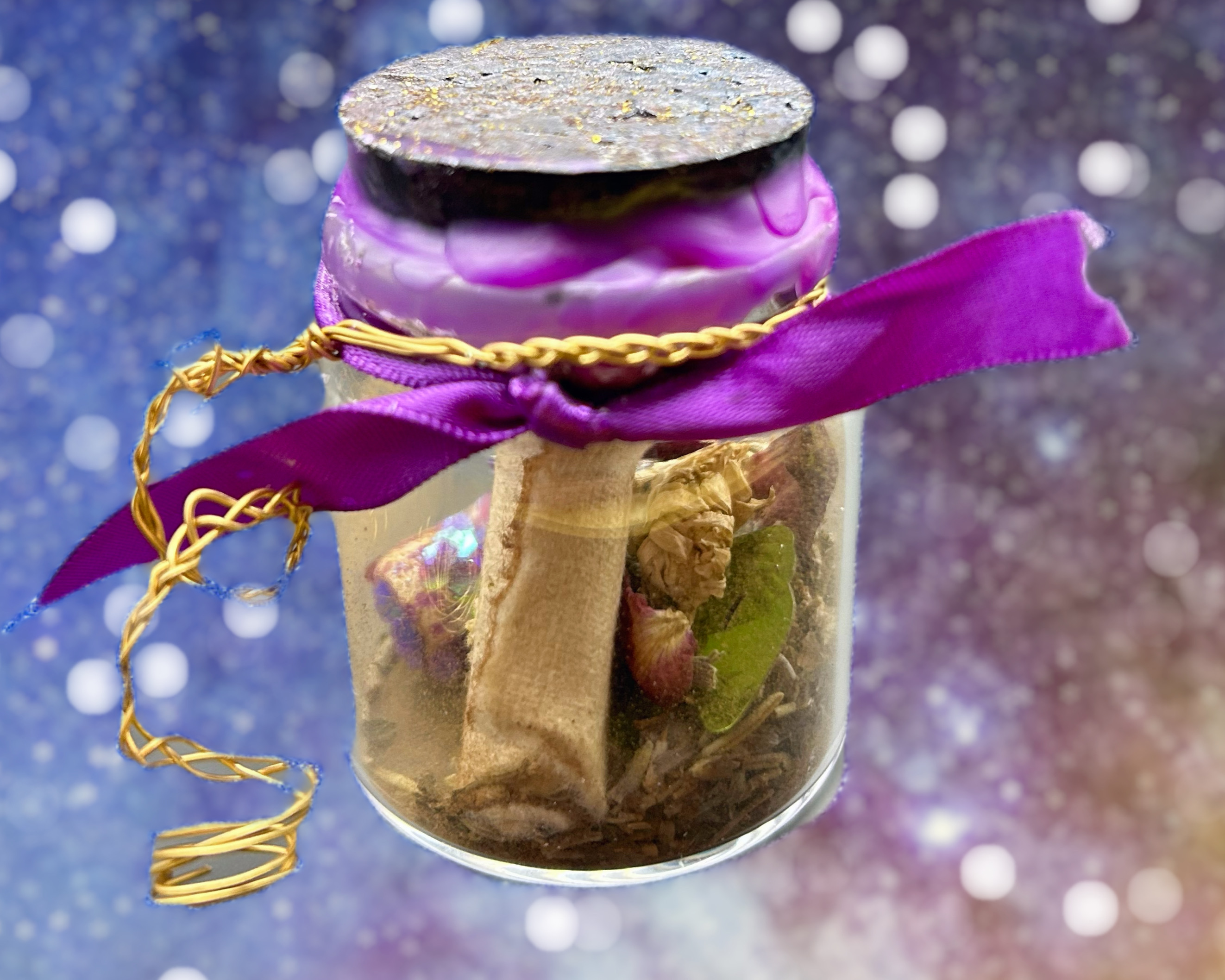 Using multiple references and guides on correlations, I create a collection of crystals, herbs, spices, flowers, symbols, and other ingredients to support the energy of the intention. I always include a small scroll for you to write your intention on and tuck inside your jar. To seal your jar, you’ll get a colored piece of ribbon and a candle that aligns with your intention.
